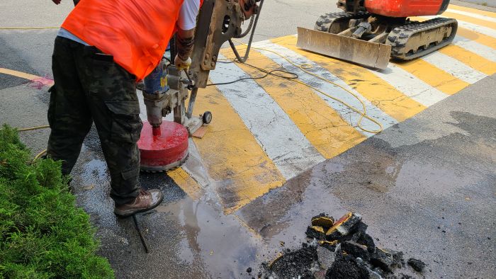 바닥에는 스윙텍터 베이스의 형태와 위치에 맞추어 코어 타공 작업 후 강도 높은 콘크리트를 사용하여 보호대를 설치할 수 있는 기초공사를 실시합니다.