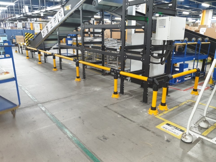 당사는 고객사 요청으로 물류창고 내 컨베이어 보호를 목적으로 스윙텍터를 설치,