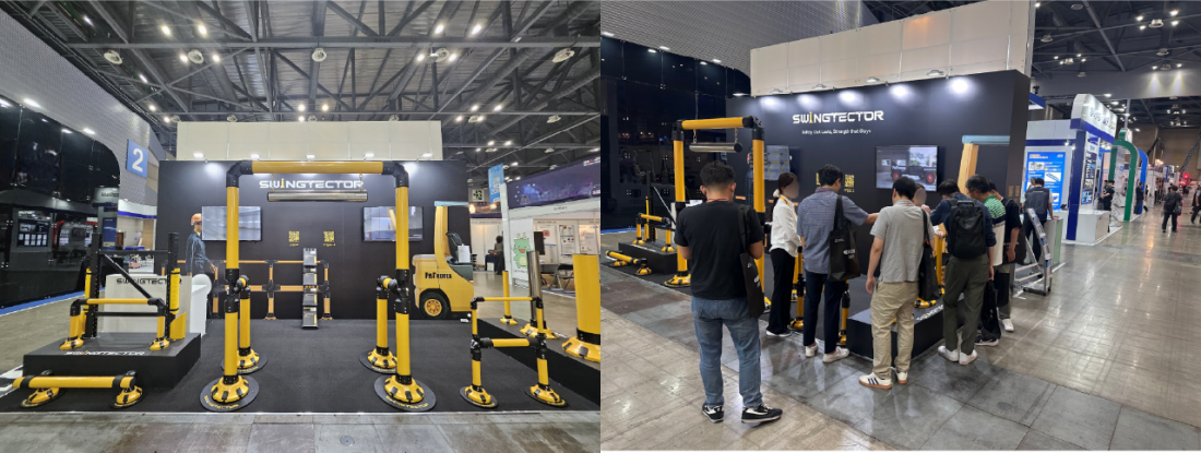이번 전시에서 선보인 스윙텍터는 충격을 흡수하여 바닥 파손을 최소화하는 탄성 보호대입니다.