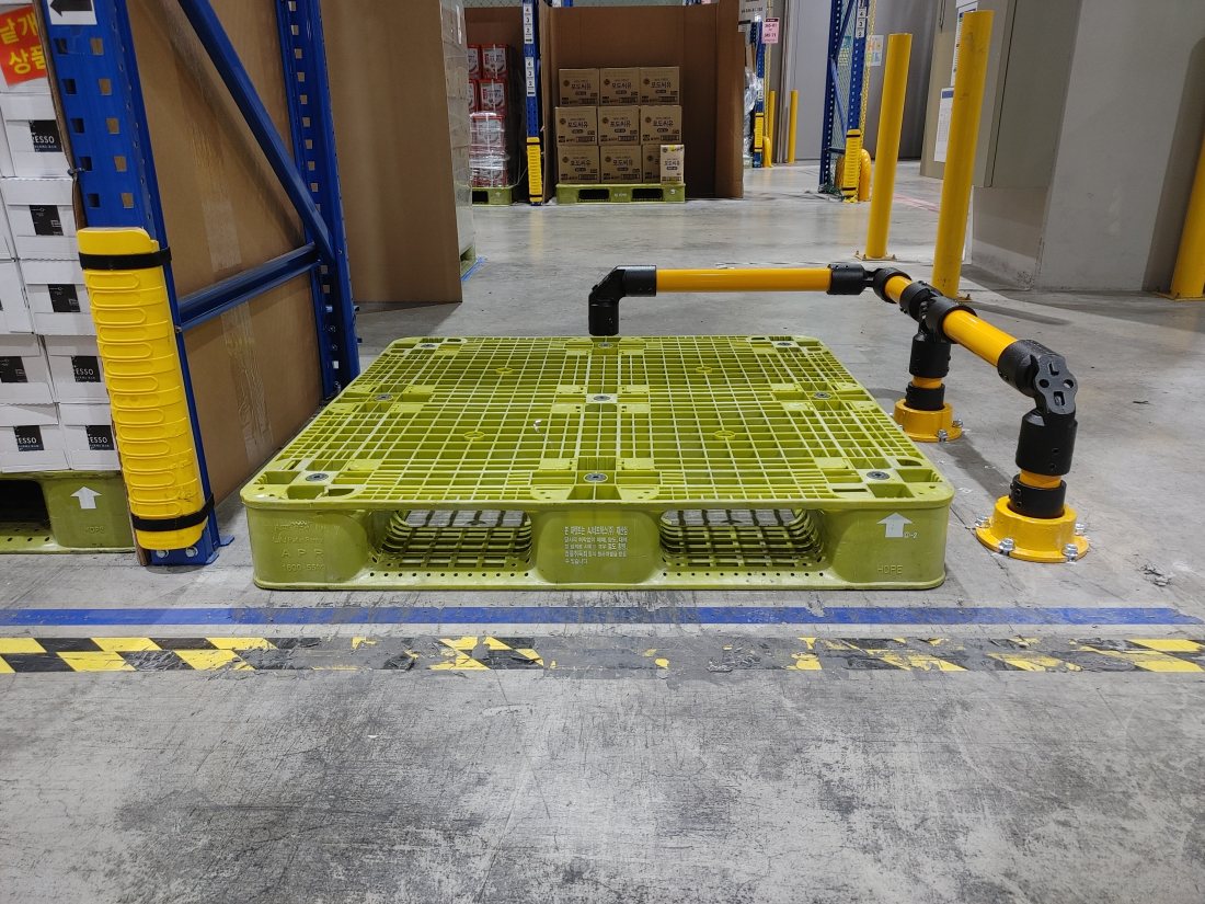 다음의 사진들은 물류 창고에서 파렛트의 보관 구역을 정확히 구분하기 위해 '스윙텍터 S type Corner' 제품을 설치한 케이스입니다.